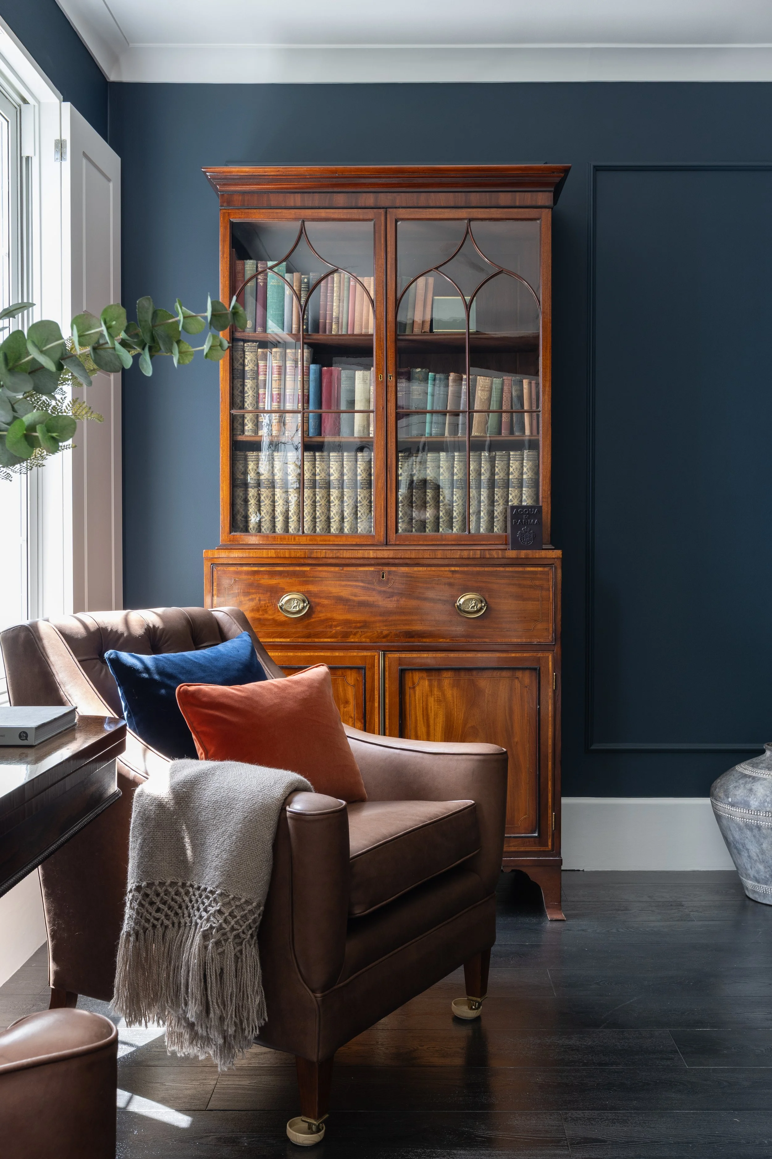 This room was conceived as a modern interpretation of a gentleman’s club, reimagined with a softer, contemporary edge. The palette, anchored in deep, moody blue, establishes an enveloping backdrop that enhances the warmth of antique furniture and rich leather textures.